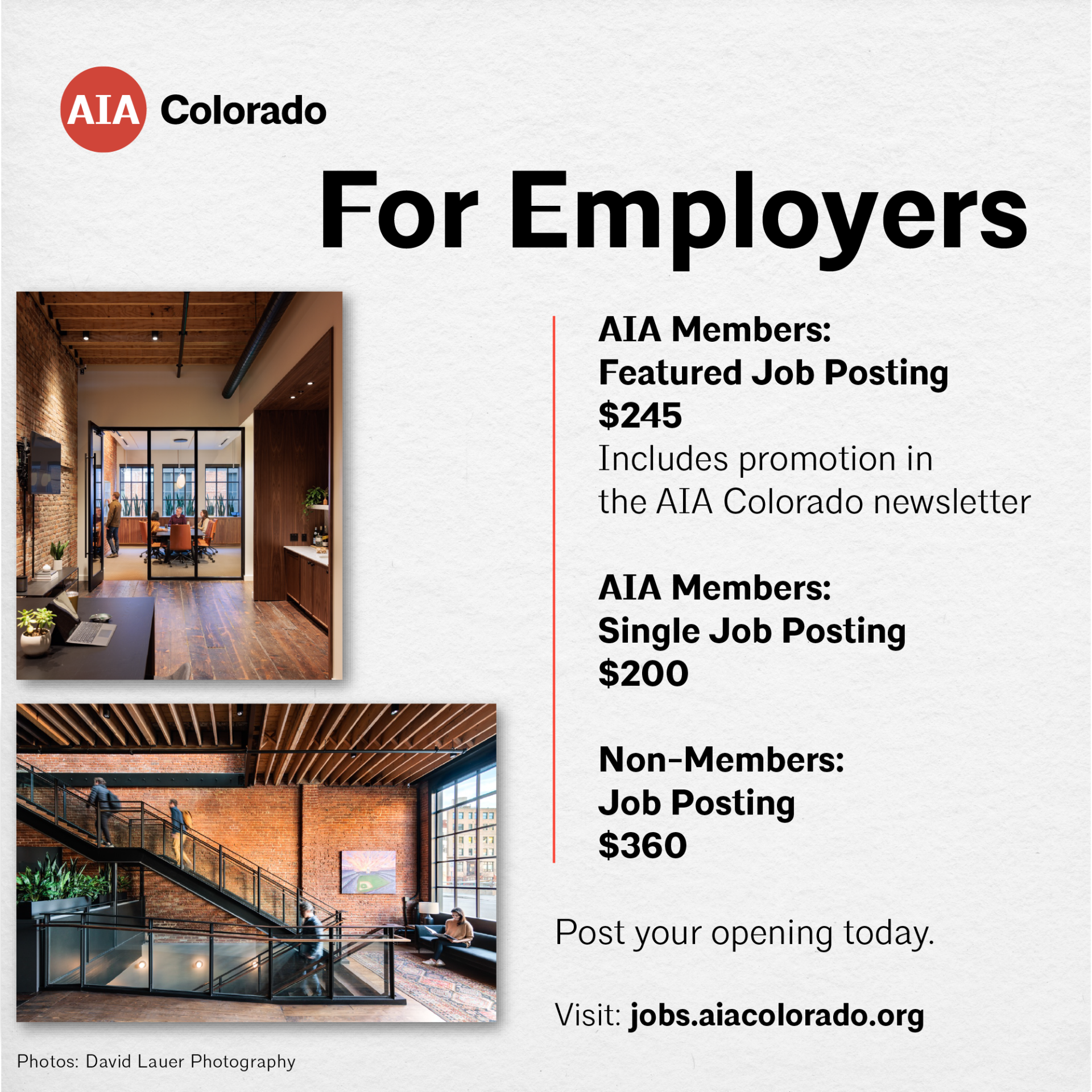 The AIA Colorado Job Board is updated daily. Looking for your next career move? Explore fresh job listings updated daily. Hiring? Showcase your open position for 30 days and connect with top-tier talent.