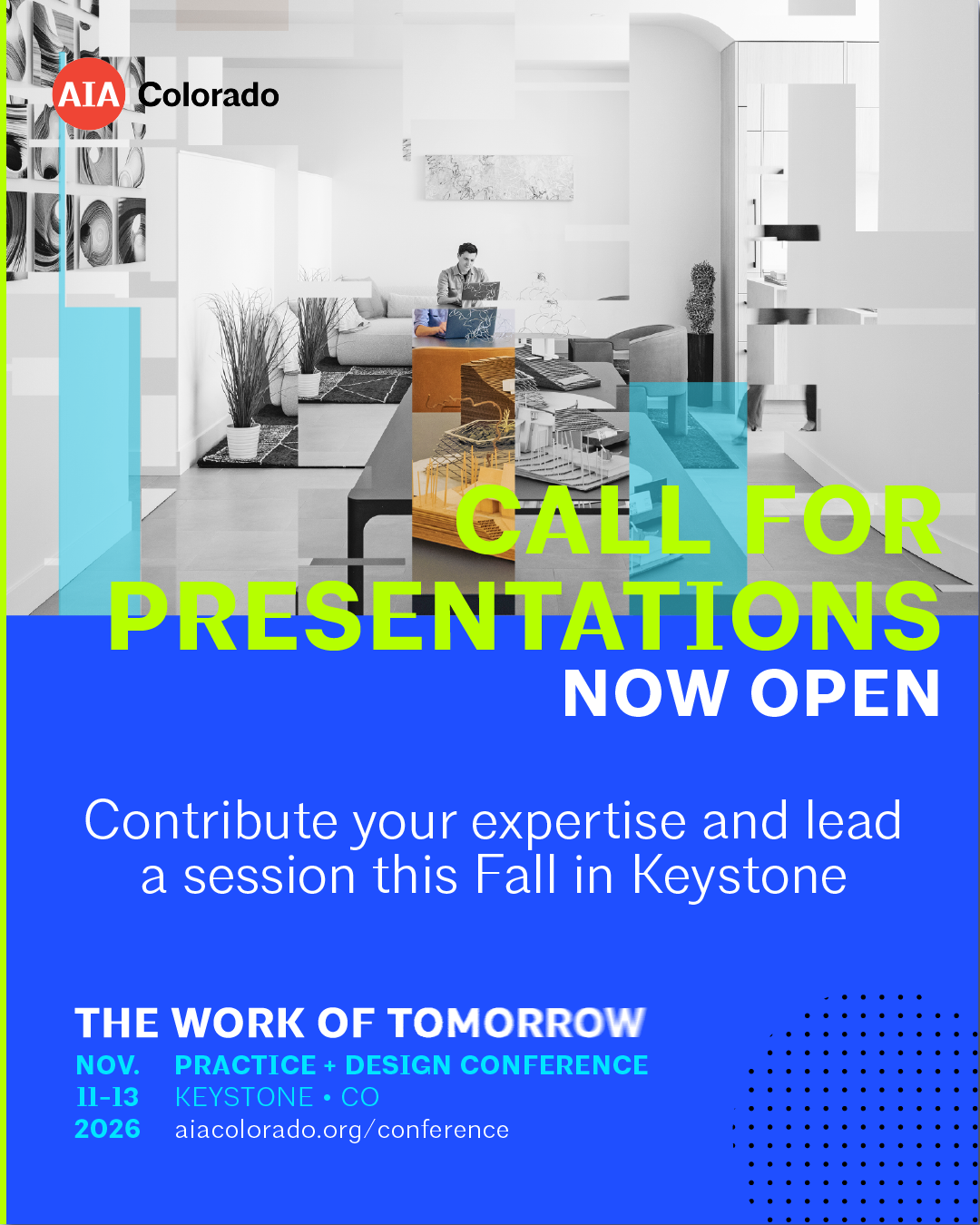 Join us November 11–13, 2026 at Keystone Conference Center. Stay tuned to AIA Colorado’s newsletter, social media accounts, and this page for updates!